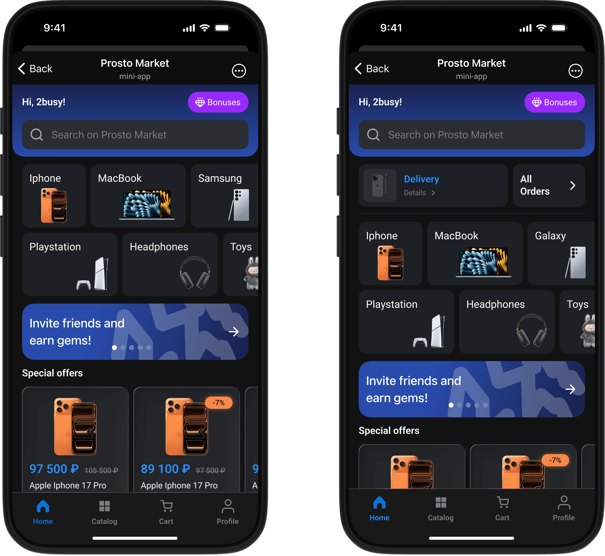 Each card was designed with a clear hierarchy of content, actions, and states. Whether it shows a product, an order, a category, or a bonus mechanic, the structure stays familiar, which reduces cognitive load and helps users understand the interface faster.